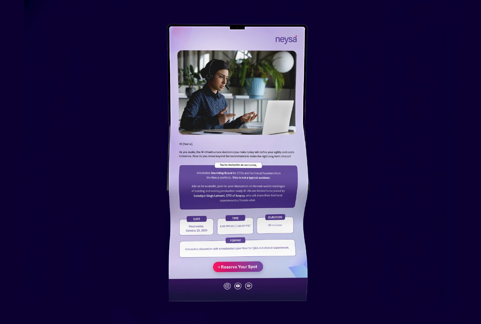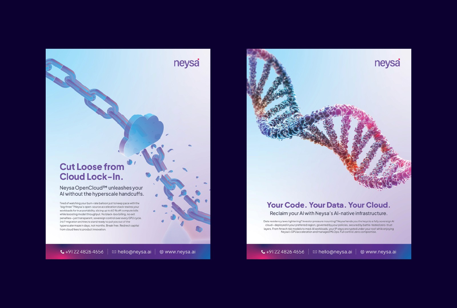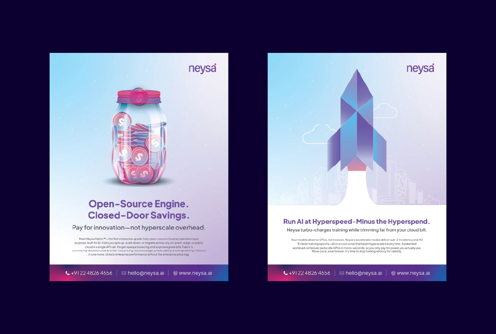 Creashna collaborated with Neysa, an AI infrastructure and machine learning platform, to create visual communication assets that support their digital marketing initiatives. The work included designing a custom character illustration, emailers, and web banners that align with Neysa’s technology-focused brand identity. The objective was to simplify complex AI concepts through engaging visuals while maintaining a clean and modern design language across their digital platforms.
